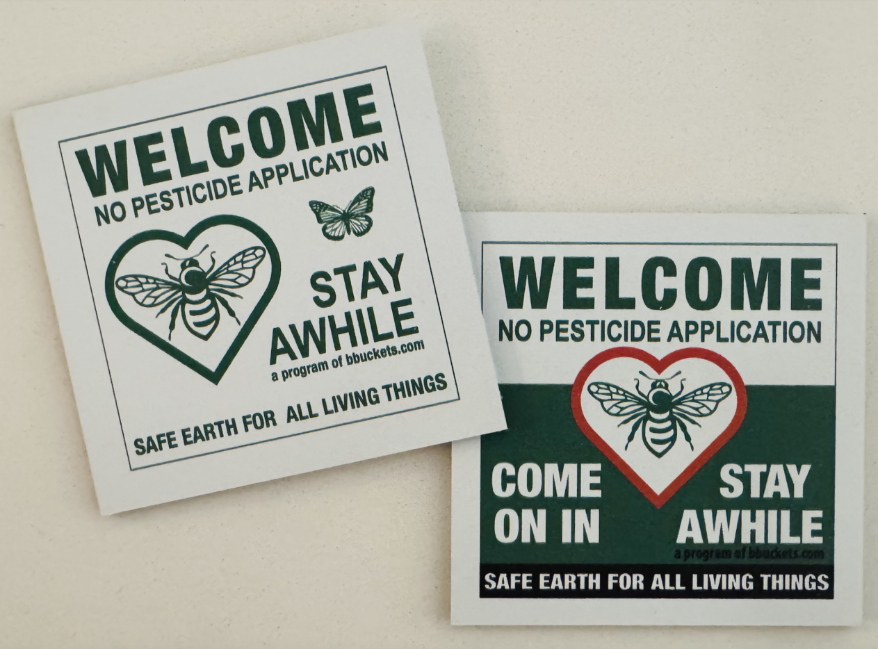 BBuckets’ WELCOME signs, both paper and aluminum, seek to counteract the messages and missions of the CAUTION signs left after yard applications, whether of mosquito fogging pesticides or pre-emergent herbicides, both of which kill beneficial insects and disrupt food chains and lifecycles