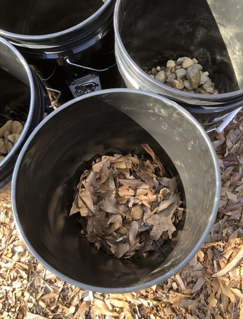 Once you have determined locations, add some organic material from your yard to your buckets: grass clippings, leaves, so-called weeds, anything that will decompose in water. (I recommend staying away from English ivy or other plants with waxy leaves as they don’t decompose well.)